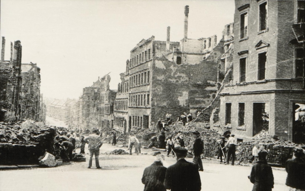 Chemnitz-Sonnenberg 1945. Blick von der Martinstraße zur Hans-Sachs-Straße 1945. Ruinen und Trümmerberge. Trümmerfrauen und Männer beim Beräumen der Straße. Die Markusstraße, von der Hans Schlüter auch berichtet, befindet sich in unmittelbarer Nähe. (Bild: Stadtarchiv Chemnitz, mit freundlicher Genehmigung des Stadtarchivs für die "Chemnitzer Geschichten")